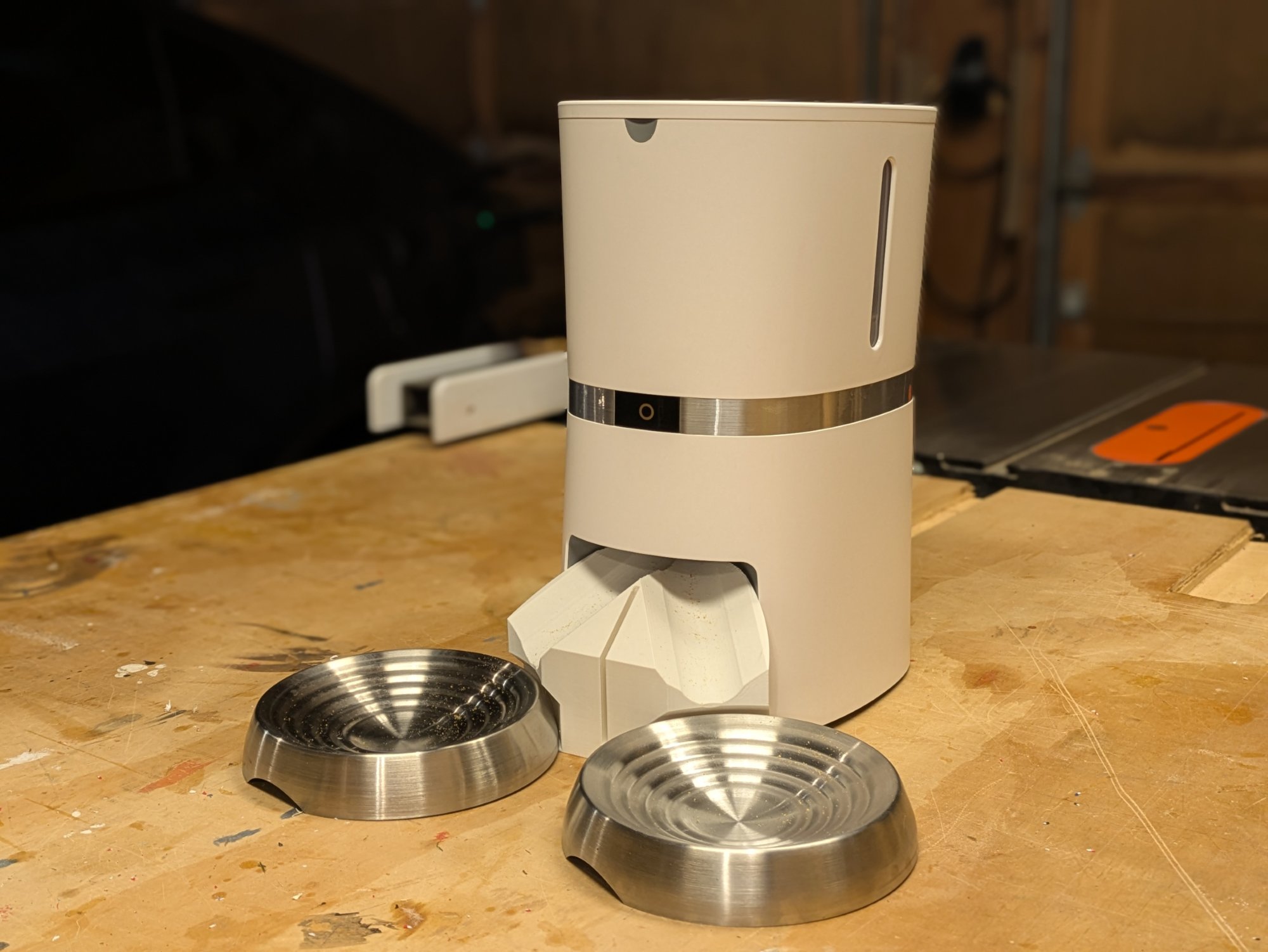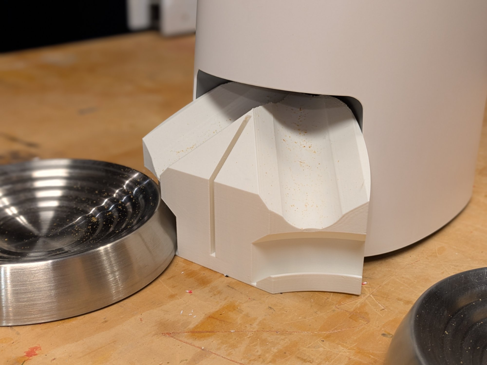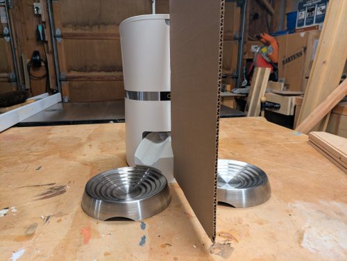 We haven’t used it since then but we have a coule more quick trips coming up so I decided to improve it. Through a LOT of trial and error in Fusion 360 and lots of 3D prints, I eventually designed a new attachment for the dispenser which not only shouldn’t jam as easily, but it is the perfect height for the bowls we like to use, it holds the bowls securely in place so they don’t slide away from the feeder, and it holds a piece of cardboard between the bowls so that one cat doesn’t get intimidated by the other. It even has a little hook on the back that fits into a spot on the feeder to securely hold it in place.