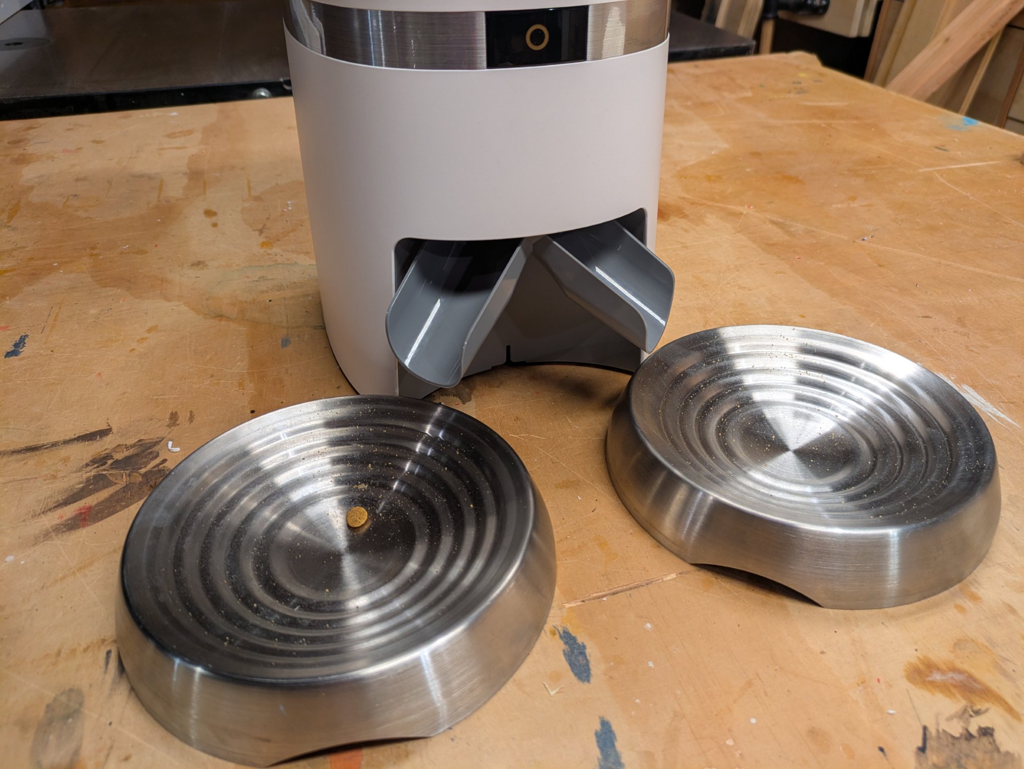 When we were in Yellowstone last summer, we had planned to only have Megan come over every 2 days and just use the automatic feeder. But one of the first nights, I checked our cameras (yes we have a camera in the cat room) and it looked like the feeder was jammed. I don’t know why the cats weren’t eating it but something was clearly wrong, so not only did we then need Megan over there every day, but she also had to make a late evening run over to our house to immediately fix the situation. (Thank you Megan!) Ultimately I think the problem was that the divider chute didn’t meet up with the bowls well but there might also have been an issue with the food not having enough room to drop out of the machine and onto the chute.