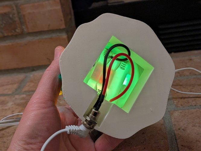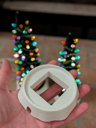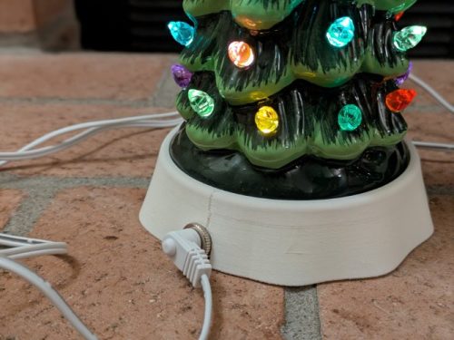 I turned to Fusion 360 and modeled a base that is about 3/4″ tall and has a lip that surrounds the base of the tree. There’s a cutout in the bottom to feed the wires out to a hole for the jack. Since Fusion 360 is parametric, I was able to just adjust some parameters for each of the three trees and print out three different sizes. That worked but my initial design was a pure cone shape. It looked a little awkward, so I made the edges of the bottom wavy like snow and that improved things dramatically.